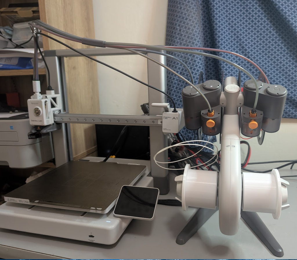 Pictured to the right is my new Bambu A1 3d Printer. I got mine with the AMS. That’s the four spool holder on the right that can do multiple colors. I didn’t need it, but it’s cool and takes up more desk space… and it’s pretty neat. Multi-color prints are cool.